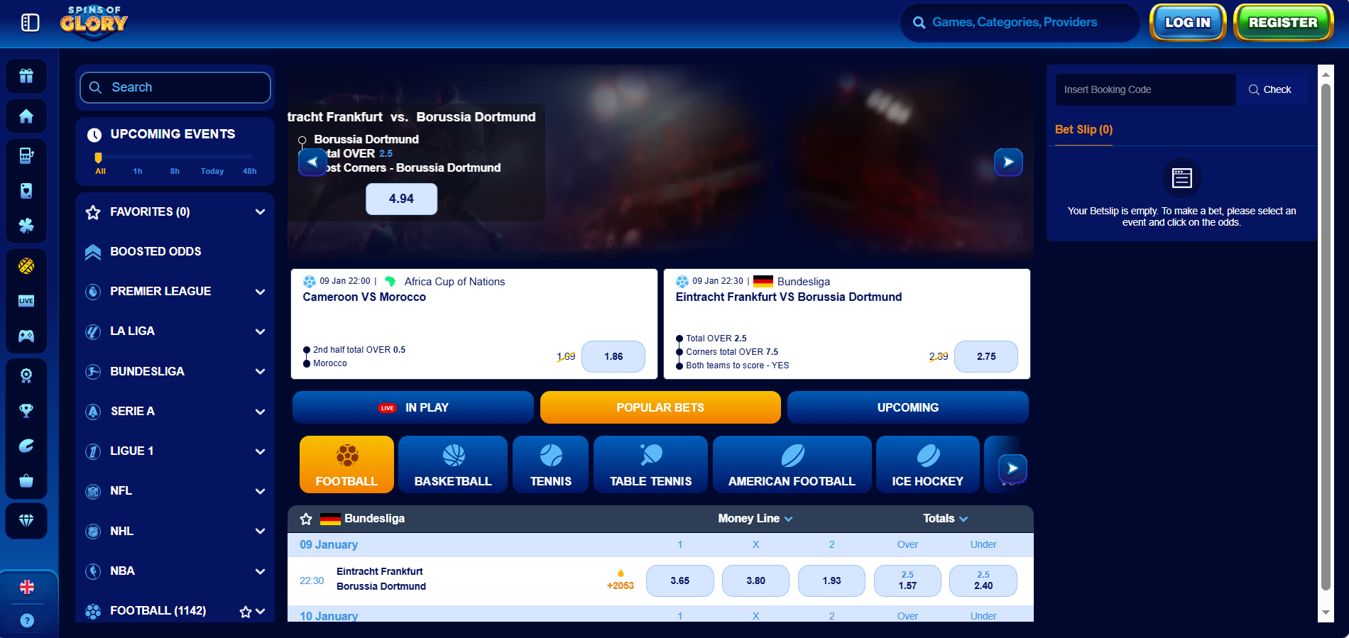 The casino and sportsbook combination is what sets Spins of Glory apart from slots-only platforms. I'm primarily a casino player, but I tested their sports betting with €100 across football and tennis markets. Available Sports MarketsThe sportsbook covers 20+ sports including: